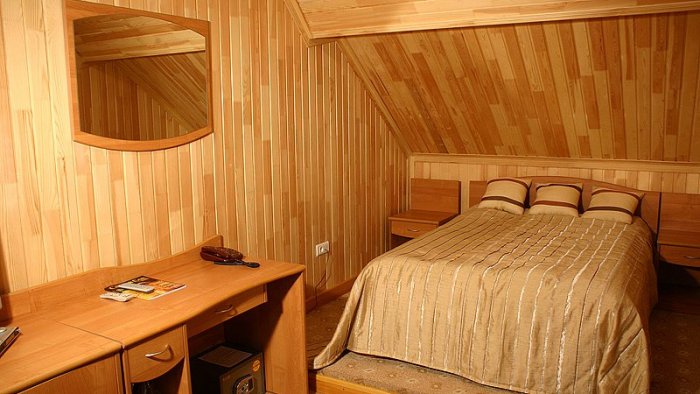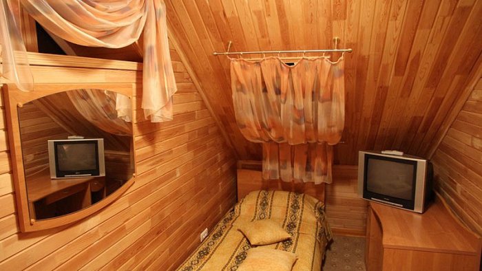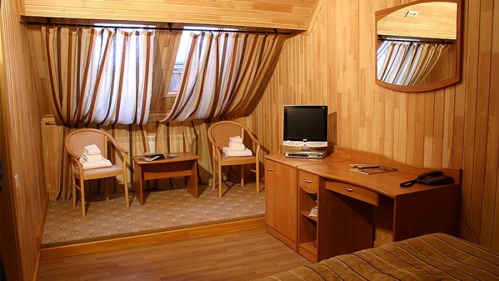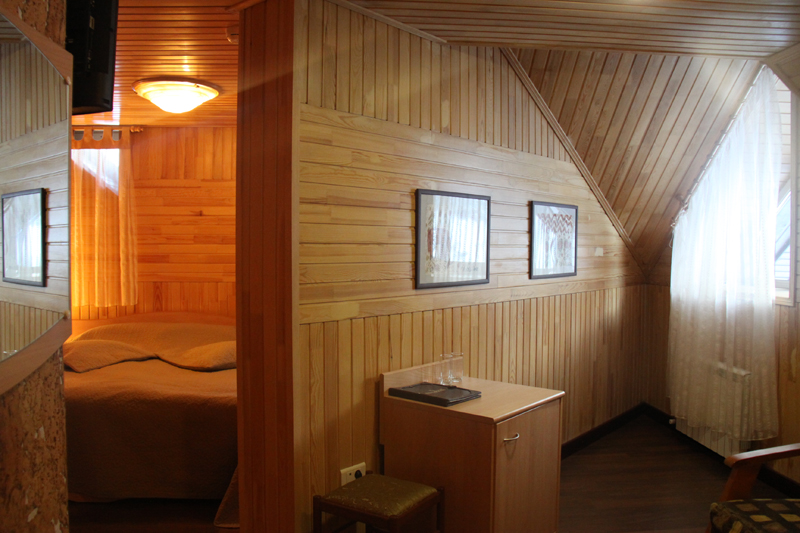 – Стандарт в мансарде (1 номер). 1 основное место / 0 дополнительных мест. Однокомнатный мансардный номер: односпальный диван, кресло, стол, холодильник, телевизор. Санузел: душевая кабина или ванна, раковина, фен, халат, тапочки, набор полотенец, умывальные принадлежности (зубная щетка, зубная паста, разовое мыло, разовый шампунь), унитаз. Площадь номера: 17 кв.м.
