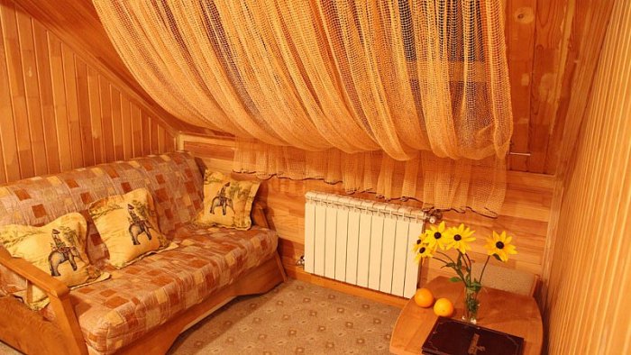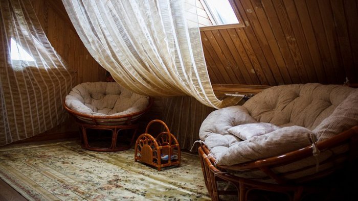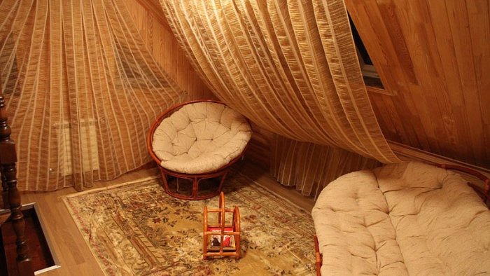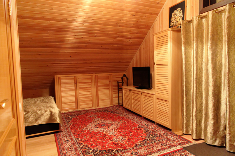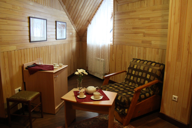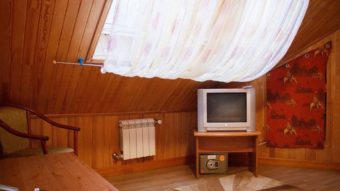 Однокомнатный мансардный номер: односпальный диван, кресло, стол, холодильник, телевизор.