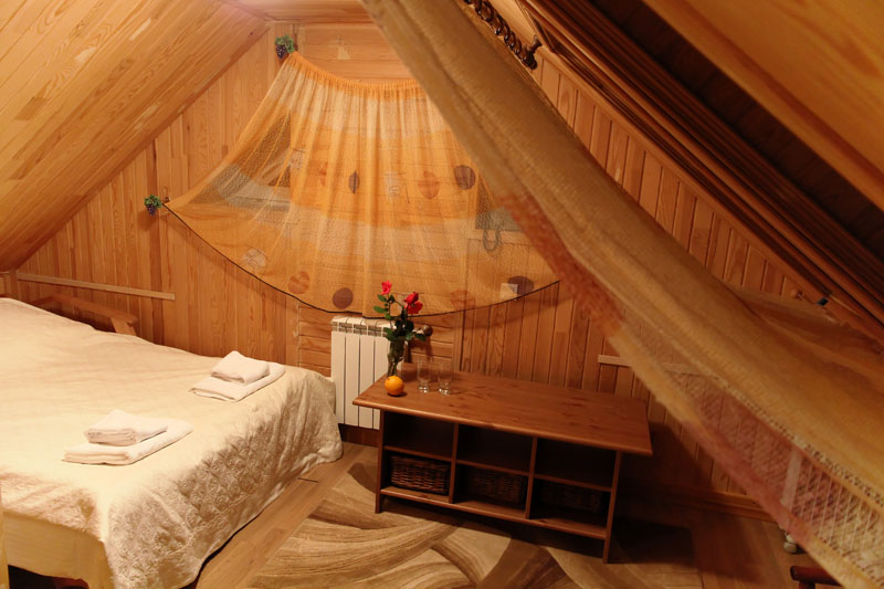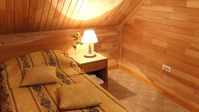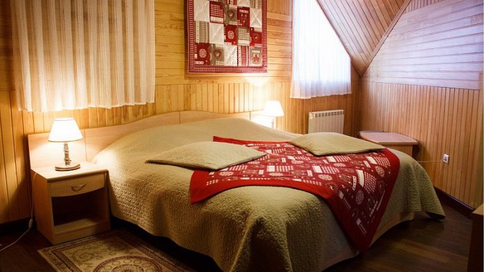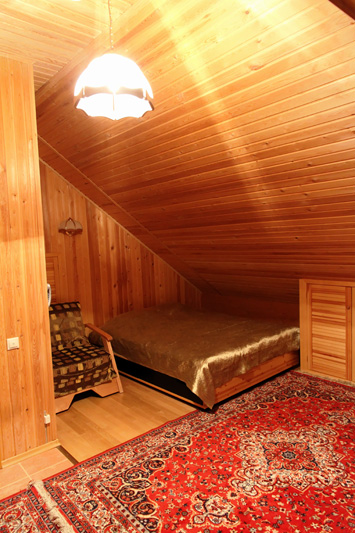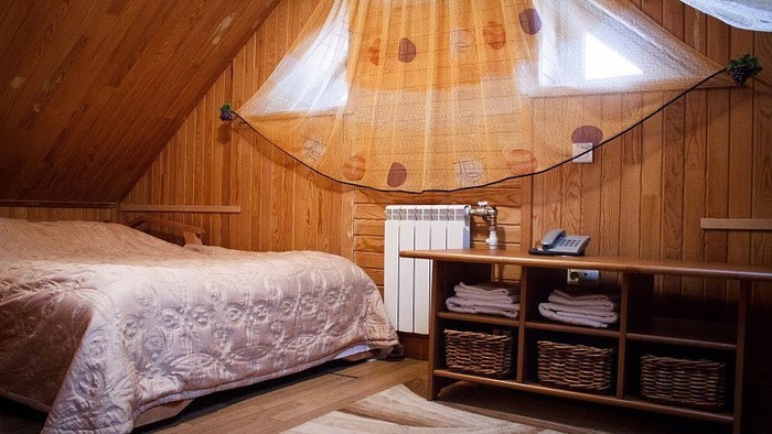 – Охотничий домик (1 номер). 2 основных места / 0 дополнительных мест. Однокомнатный номер: двуспальная кровать, кресло-кровать, мини-бар, сейф, телефон, телевизор. Санузел: душевая кабина или ванна, раковина, фен, халат, тапочки, набор полотенец, умывальные принадлежности (зубная щетка, зубная паста, разовое мыло, разовый шампунь), унитаз. Площадь номера: 30 кв.м.