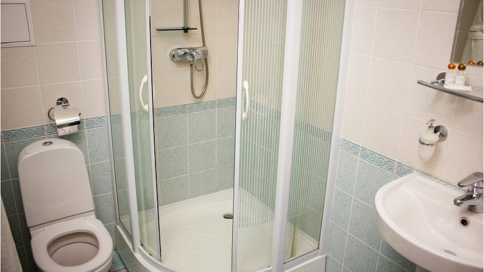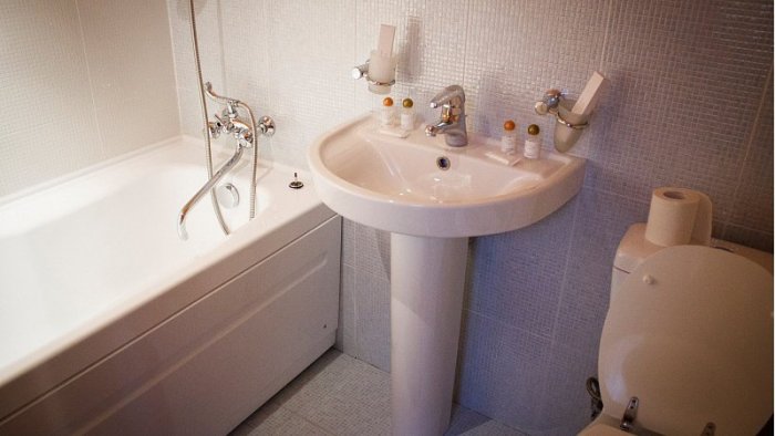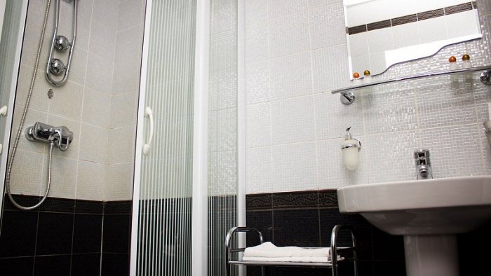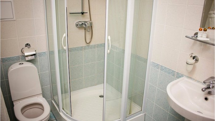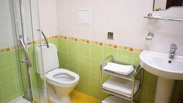 Санузел: душевая кабина или ванна, раковина, фен, халат, тапочки, набор полотенец, умывальные принадлежности (зубная щетка, зубная паста, разовое мыло, разовый шампунь), унитаз.