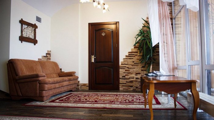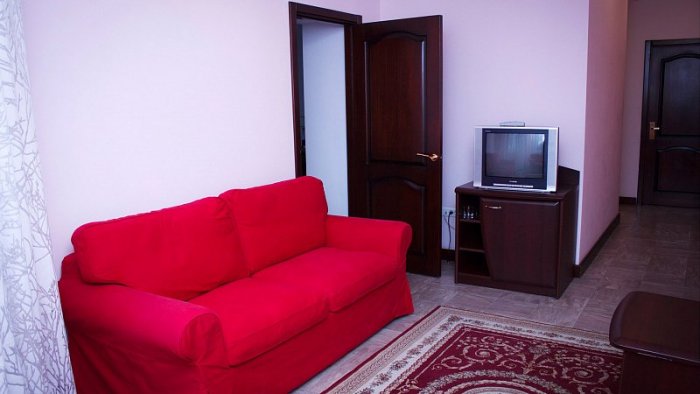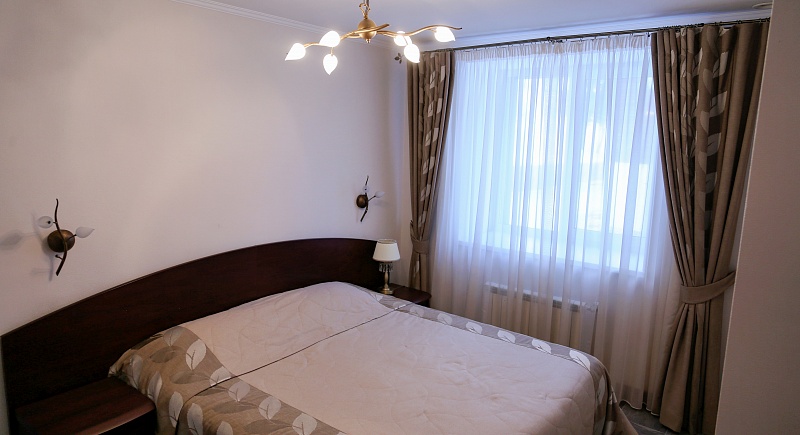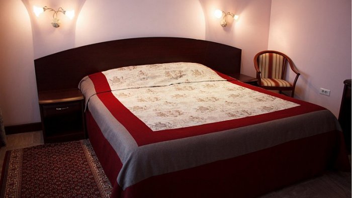 – Люкс (5 номеров). 2 основных места / 2 дополнительных места (предоставляются на диване). Двухкомнатный номер. Гостиная: диван, кресла, журнальный столик, мини-бар, холодильник, телефон, телевизор. Спальня: двуспальная кровать, прикроватная тумба, туалетный столик, стулья, зеркало, сейф, телевизор. Санузел: душевая кабина или ванна, раковина, фен, халат, тапочки, набор полотенец, умывальные принадлежности (зубная щетка, зубная паста, разовое мыло, разовый шампунь), унитаз. Площадь номера: 35 кв. м.