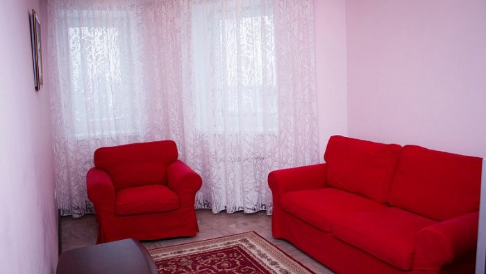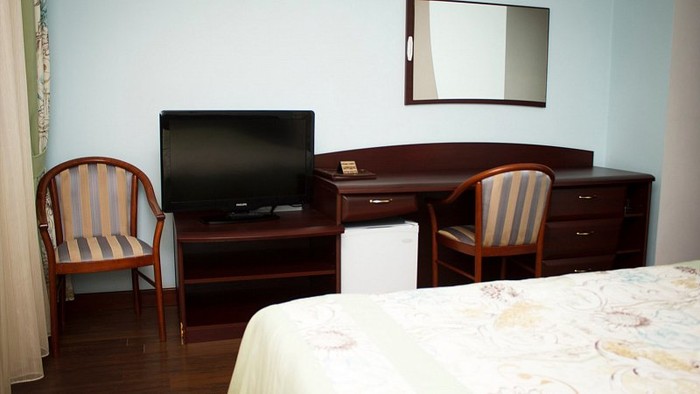 Однокомнатный зонированный номер: две односпальные кровати (при необходимости сдвигаются), прикроватные тумбы, стол, столик, стул, зеркало, холодильник, набор посуды, телевизор.