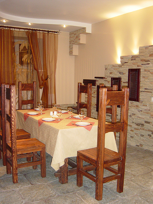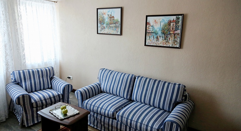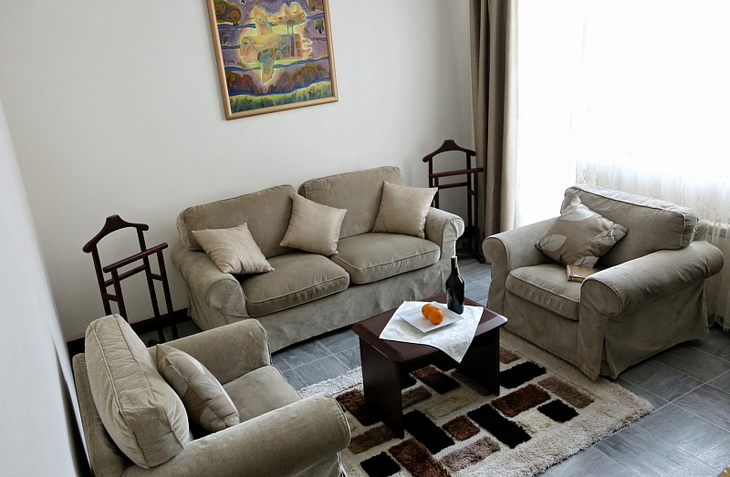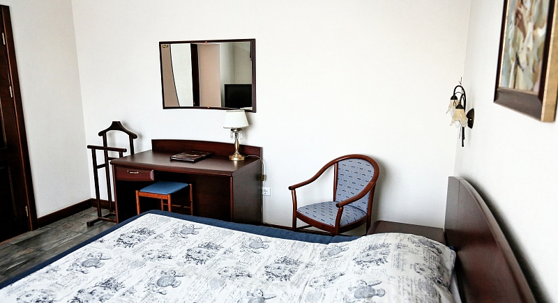 Однокомнатный номер с отдельным входом во флигеле: двуспальная кровать, кресло-кровать, мини-бар, сейф, телефон, телевизор.