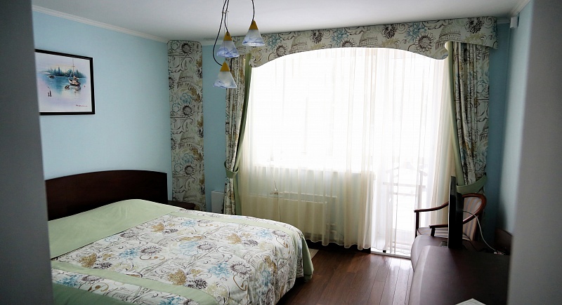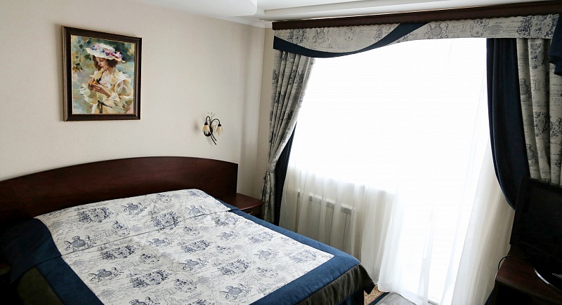 – Стандарт + (2 номера). 1+1 основных места / 0 дополнительных мест. Однокомнатный номер: двуспальная кровать / две односпальные кровати, прикроватная тумба, стол, стулья, зеркало, сейф, холодильник, телевизор. Санузел: душевая кабина или ванна, раковина, фен, халат, тапочки, набор полотенец, умывальные принадлежности (зубная щетка, зубная паста, разовое мыло, разовый шампунь), унитаз. Площадь номера: 18 кв.м.