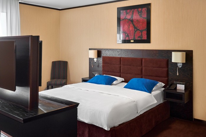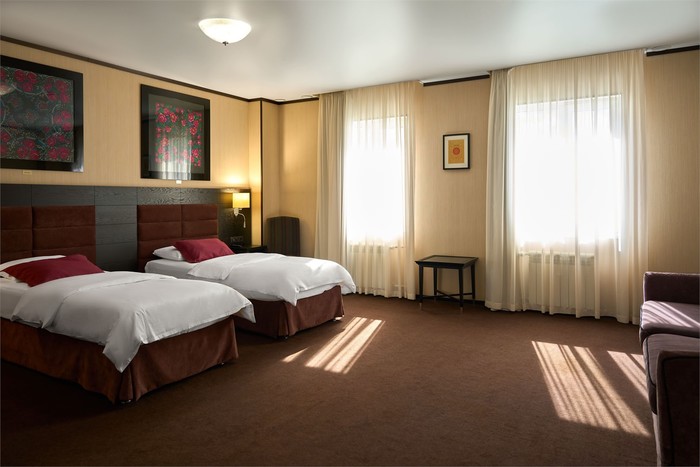 1 | две 1-спальные | 35 м2, прихожая, тумбочки, письменный стол, шкаф, гладильная доска, стулья, кресло, телевизор, кондиционер, телефон, чайник, чайный набор, сейф | туалет, умывальник, душевая кабина, халаты, тапочки, фен | раскладная кровать | |