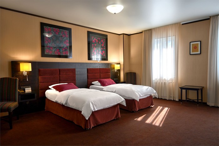 2 осн | 1 | две 1-спальные | 21-23 м2, прихожая, тумбочки, письменный стол, шкаф, стулья, телевизор, кондиционер, телефон, чайник, чайный набор, сейф | туалет, умывальник, душевая кабина, халаты, тапочки, фен | нет | |