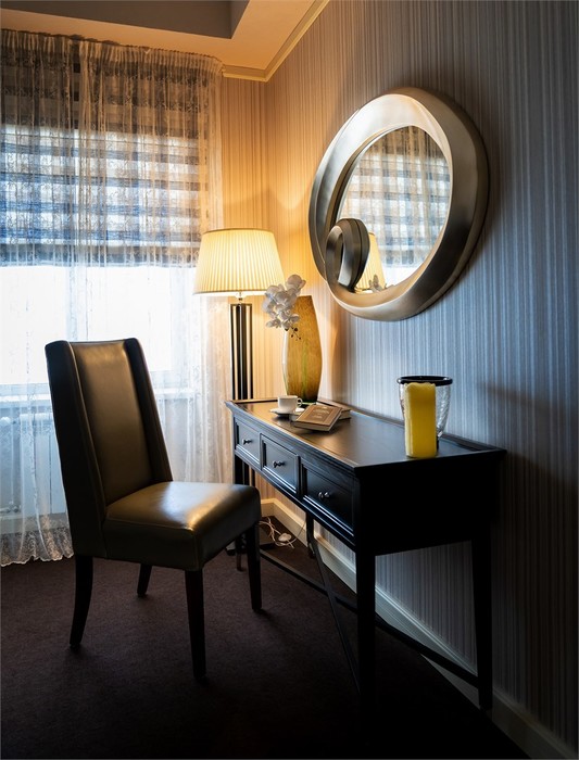 21-23 м2, прихожая, тумбочки, письменный стол, шкаф, стулья, телевизор, кондиционер, телефон, чайник, чайный набор, сейф