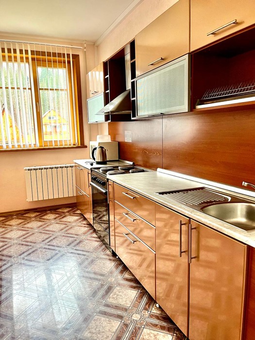 3 | 2-спальная | 33 м2, в спальной комнате: тумбочки, шкаф, стулья в гостиной: набор мягкой мебели, журнальный столик, диван, телевизор собственная кухня: кухонный гарнитур с мойкой, эл. плита, микроволновая печь, холодильник, чайник, набор посуды, стол, табуреты |