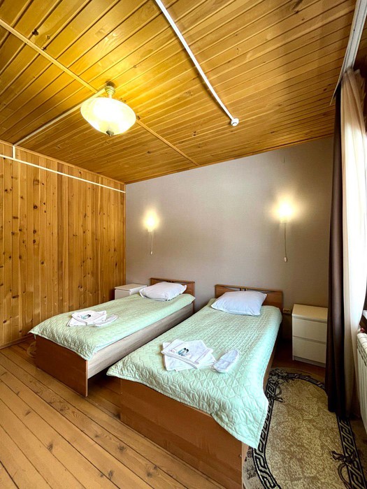 2-этажный коттедж, корпус 3, над баней | 2 осн | 1 | две 1-спальные | 9 м2, прикроватные тумбочки, шкаф, телевизор в общем блоке на 3 номера: оборудованная кухня (кухонный гарнитур с мойкой, эл. плита, микроволновая печь, холодильник, чайник, набор посуды, стол, табуреты) |