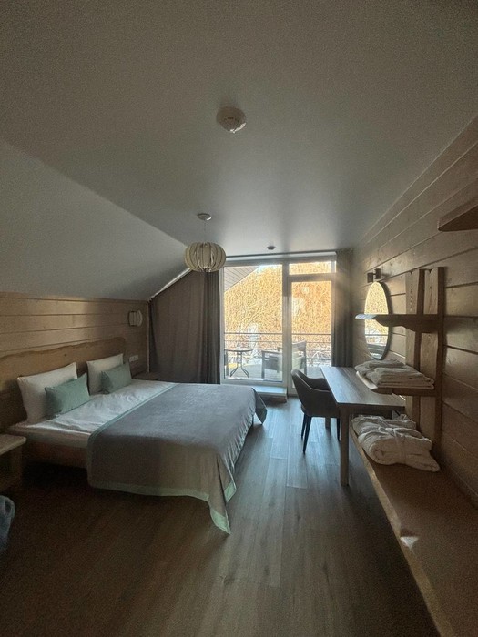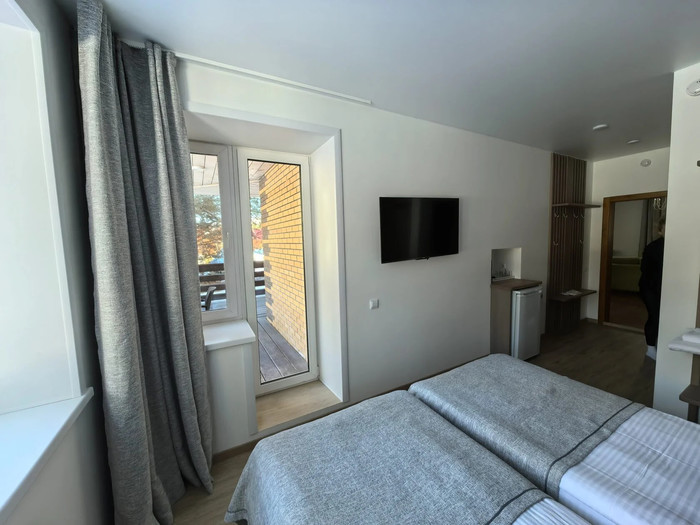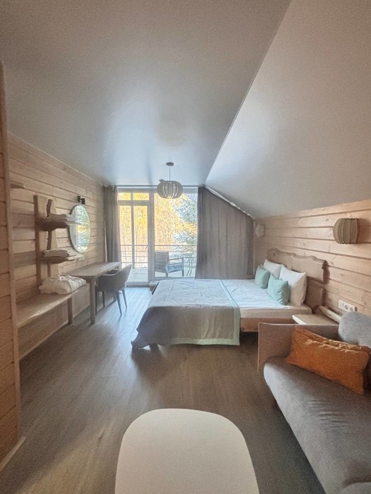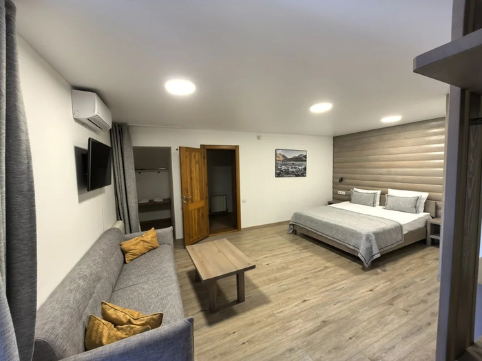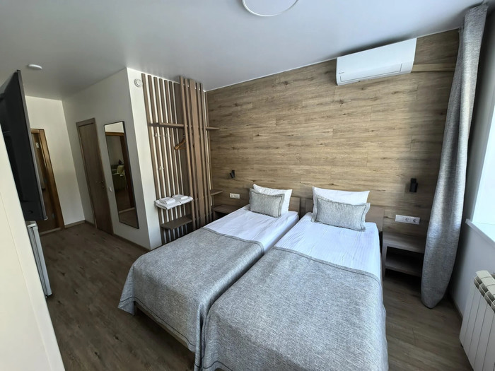 1 | 2-спальная | 40 м2, вешалка, прикроватные тумбочки с бра, столик, диван, стол, стулья, вешалка, телевизор, мини-холодильник, чайник? кондиционер | туалет, умывальник, душ, халаты, набор полотенец, фен | нет | диван |