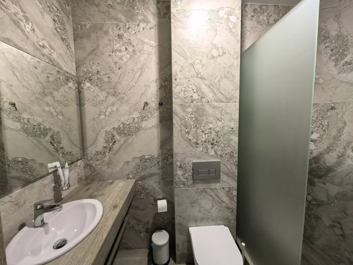 в одном из номеров два санузла на 1 и 2 этаже: туалет, умывальник, душевая кабина, халаты, набор полотенец, фен, гигиенические принадлеж-ности в остальных номерах один санузел: туалет, умывальник, душевая кабина, халаты, набор полотенец, фен |