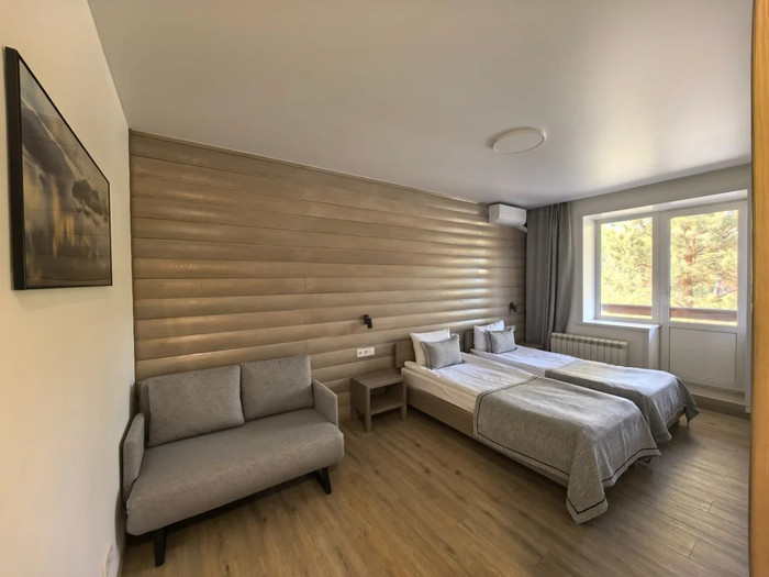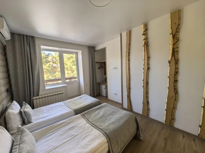1 | две 1-спальные | 30 м2 вешалка, прикроватные тумбочки с бра, пуфик, телевизор, мини-холодильник, чайник, кондиционер | туалет, умывальник, душ, халаты, набор полотенец, фен | терраса | диван |