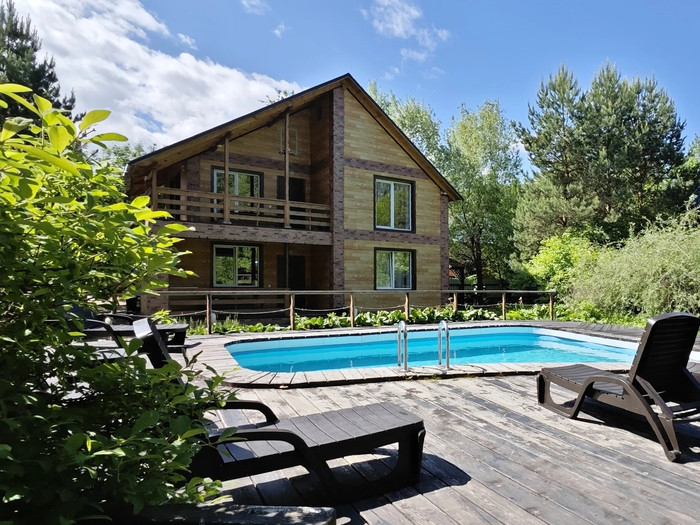 2-этажное шале с террасой, мангальной зоной и видом на горы, откртый бассейн рядом | 2 осн 3 доп |