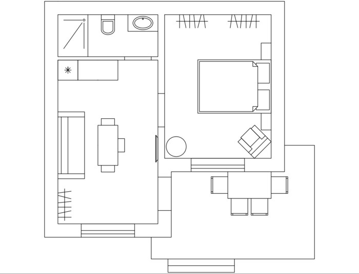 балкон (два стула, столик), терраса (скамейка, столик, подвесное кресло) | диван, 1-спальный диван |