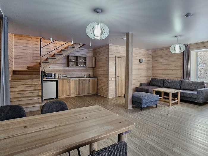 4 | 2-спальная, две 1-спальные | 60 м2 1 этаж: вешалка, диван, столик, пуфик, стол, стулья, телевизор, кухонная зона, мини-холодильник, раковина, чайник 2 этаж: прикроватные тумбочки с бра, комод, кресла |