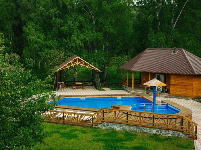 отдельностоящий 2-этажный коттедж с собственной территорией, инфраструктурой, отдельным входом в лесопарк и берег Катуни, большой беседкой с казаном и мангалом, крытым игровым павильоном (бильярд с каменным столом, настольный теннис), большой баней, большим бассейном, детским бассейном, парковкой на 5 авто | 6 осн 5 доп |