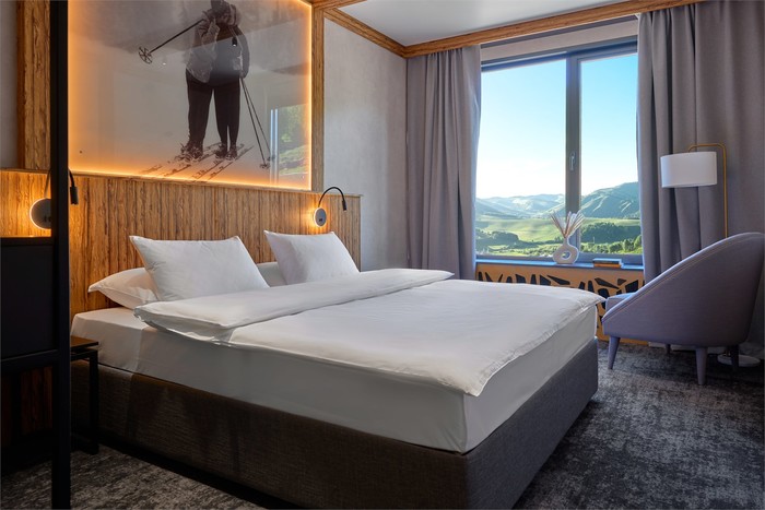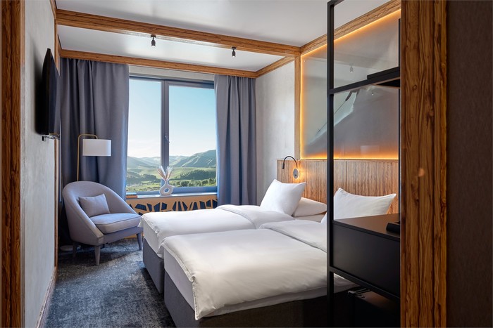 23 м2, вид на горы, номер с возможностью объединения с соседним номером категории Twin, номера соединяет одна дверь напротив шкафной секции прихожая, вешалка, шкаф, кресло, телевизор, мини-бар, чайник, кондиционер, телефон (номера могут отличаться друг от друга своей комплектацией)