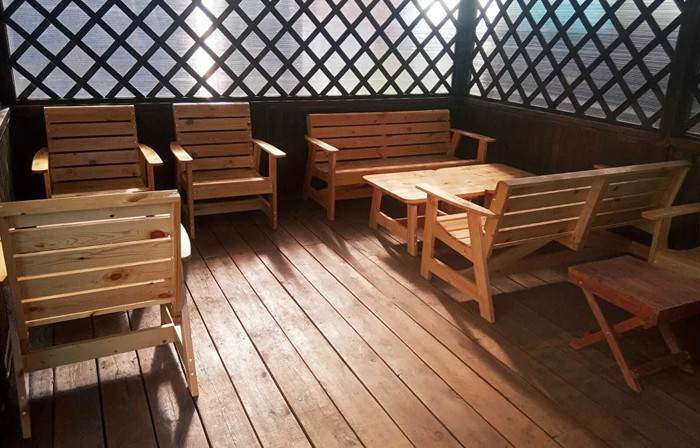 нет собственной точки питаниялетняя кухня для самостоятельного приготовления пищи: плита, холодильник, набор посуды, столы, скамейки, стулья, 5 посадочных мест
