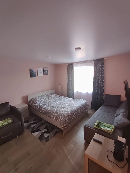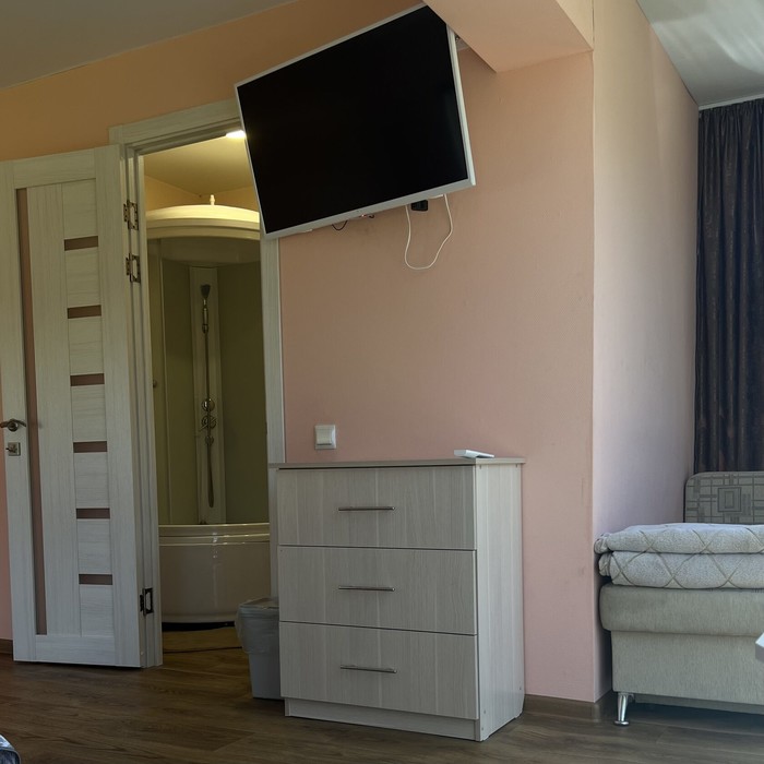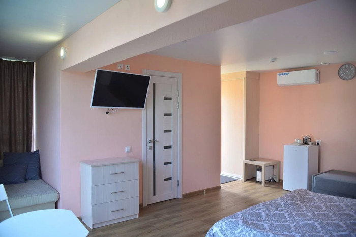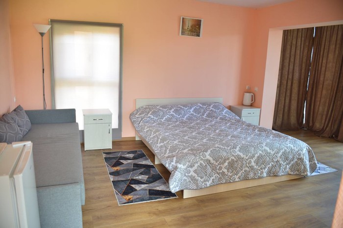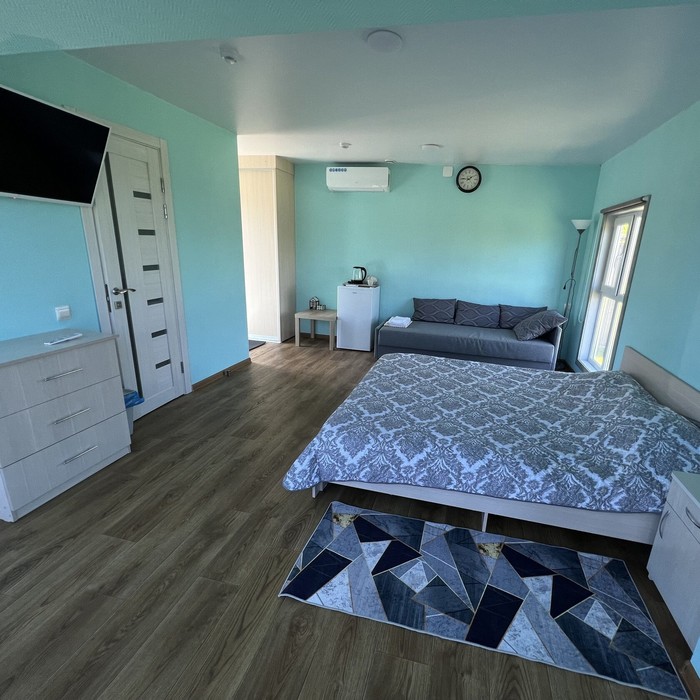 46 м2, прикроватные тумбочки, вешалка, комод, кресло, диваны, телевизор, мини-холодильник, чайник, выход на террасу