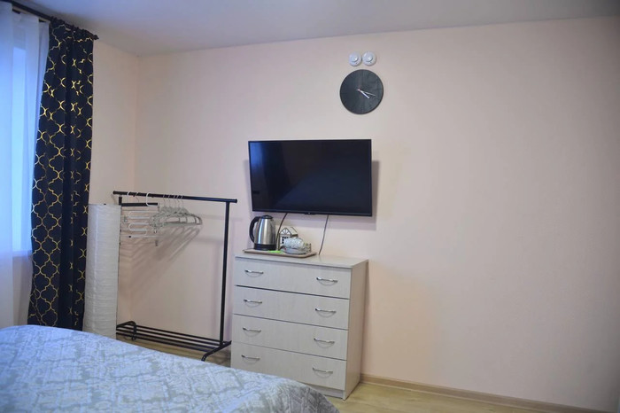 36 м2, прикроватные тумбочки, шкаф-купе, комод, стол, стулья, диван, телевизор, мини-холодильник, чайник, кондиционер