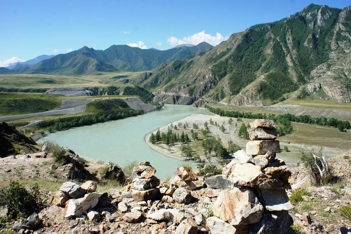 Фотостоп в сакральном месте – Чуй-Оозы. Здесь сливаются две реки: кремовые воды Чуи и бирюзовые Катуни, которые, прежде чем смешаться, «идут» рука об руку вместе. В очертаньях горы, высящейся над слиянием рек, можно увидеть голову богатыря и его лошади.