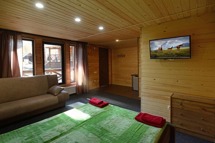 В категории «Лес»: 2-спальная кровать, раскладной диван, мини-холодильник, телевизор, стол, вешалка для одежды, комод, с/у, полотенца, веранда с плетеной мебелью с видом на территорию базы.